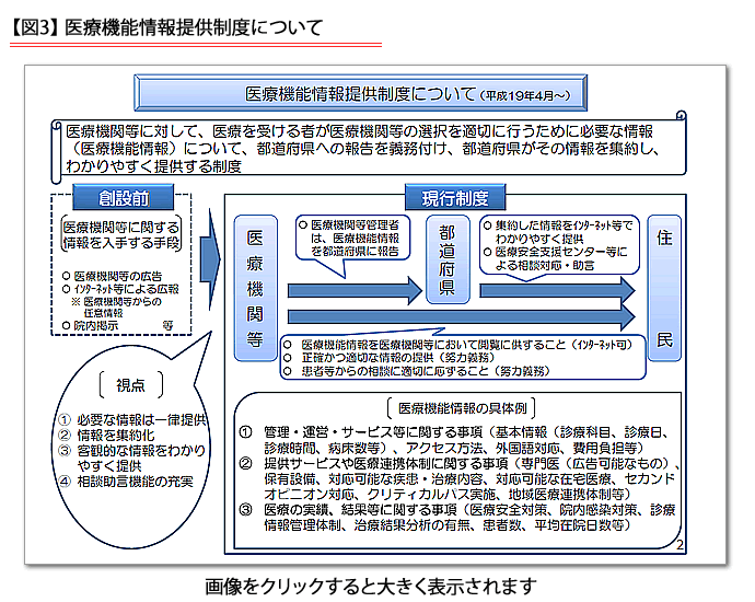 厚労省の「医療機能情報提供制度」は、国民が「どの医療機関を受診すればよいのか」を手助けするために、医療機関等(病院、診療所、歯科診療所、助産所)に自院が有する機能を毎年度、都道府県に報告することを義務付けている。都道府県は報告された情報を整理して、ホームページ上に公開している(図3 医療機能情報提供制度について)。