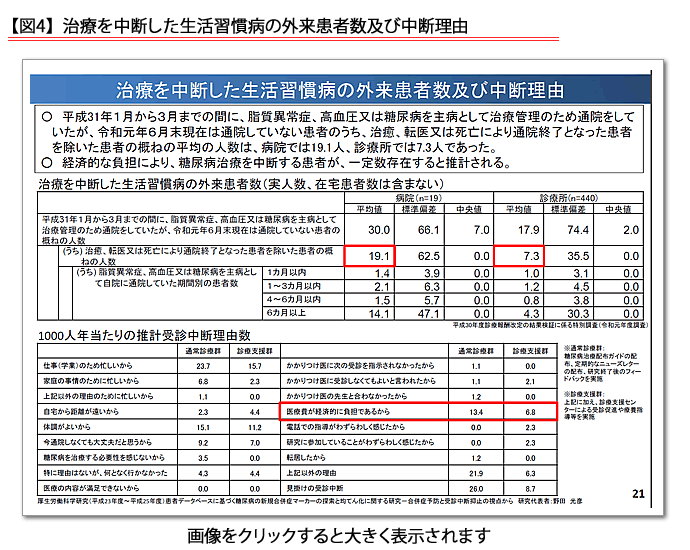 これに対して、診療側からは受診間隔が長くなり長期処方が増えることで残薬が増加することの懸念が示された一方で、支払側の幸野庄司健保連理事は、「保険者として一番怖いのは重症化である。これを予防するのが大事だ」と指摘。治療の中断理由で最も多いのが「仕事のため忙しい」という厚生労働科学研究「患者データベースに基づく糖尿病の新規合併症マーカーの探索と均てん化に関する研究~合併症予防と受診中断抑止の視点から」の調査結果(図4 治療を中断した生活習慣病の外来患者数及び中断理由)をあげ、「仕事のために中断させない方法、その一つがオンラインである」とオンライン診療の活用を訴えた。