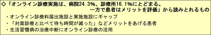 No.665 オンライン診療実施は、病院24.3%、診療所16.1%にとどまる。一方で患者はメリットを評価