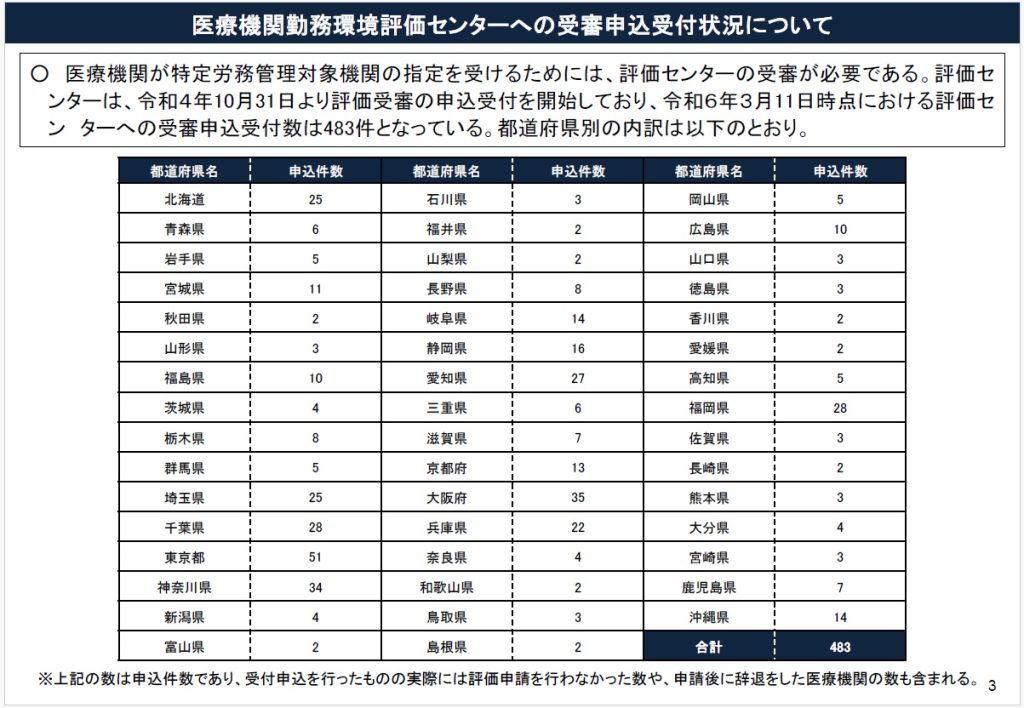 医師に年1860時間まで時間外労働をさせることができる特例水準指定の前提となる医療機関勤務環境評価センターの評価受審申し込みは、3月11日時点で483施設(申し込み後に取り下げたケースもあり、あくまで申し込み数のため、実際に指定を受ける医療機関数とは異なる)。全都道府県で申し込みがあり、多かったのは東京都51施設、大阪府35施設、神奈川県34施設、千葉・福岡両県28施設など。最少は秋田など9県の2施設だった。評価受審申し込みは2023年10月9日時点の471施設より12施設増加した(図7 医療機関勤務環境評価センターへの受審申込受付状況について)。