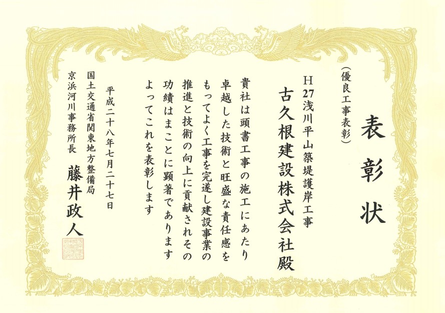 国土交通省よりH27浅川平山築堤護岸工事が優良工事として表彰されました。